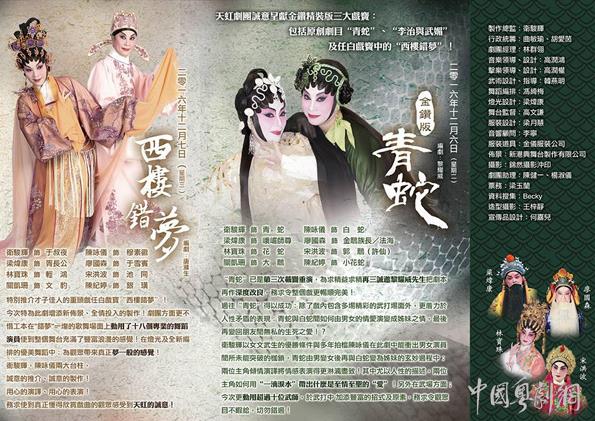 12月5-7日,著名演员卫骏辉与陈咏仪再度携手合作,在香港沙田大会堂演奏厅隆重上演粤剧《青蛇》、《李治与武媚》和《西楼错梦》三大戏宝,今次是《青蛇》第三度重演以金钻版见观众,再次由黎耀威作出修改使剧本更完美;《李治与武媚》特别呈献纪念我们尊敬的林錦堂前辈逝世三周年,藉此剧让戏迷再次怀念;《西楼错梦》重新订制多场华丽布景,更不惜工本在错梦一场起用18名舞蹈艺员演出,场面旣壮观又浪漫。本次演出由天虹剧团诚意呈献,欢迎广大戏迷落力捧场!