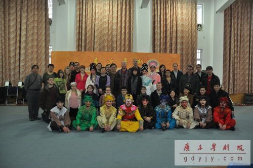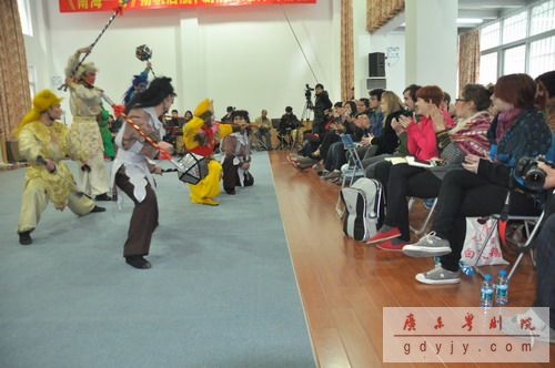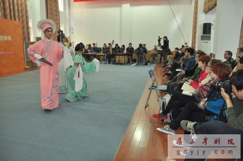 为了让外国朋友近距离接触及了解粤剧,了解演员们化妆的全过程,我院于一号会议组建了一个开放式的演出舞台;我院青年演员洪扬、谢伟新、梁晓莹、李嘉宜、康健、郭敏娴、黄春强、陈家鼎等展示了粤剧“生旦净丑”各大行当的经典折子戏选段:《白蛇传》之“游湖”、《荆钗记》之“投江”、《西游记》之“孙悟空大战八妖魔”。活动中,我院演员与美国学生一起互动起来,学生们认真地学习“耍水袖”,“扇子功”。