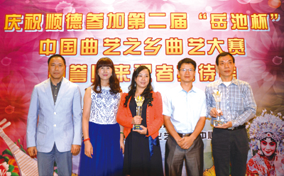 庆祝顺德参加第二届“岳池杯”中国曲艺之乡曲艺大赛载誉归来颁奖大会,10月27日傍晚在广东顺德美的君兰江山俱乐部举行。在第二届“岳池杯”中国曲艺之乡曲艺大赛中,顺德曲艺代表团获得了赛事9个金奖中的2个,银奖和铜奖个1个。广州市原市长黎子流;中国曲艺家协会副主席李时成;广东曲艺家协会主席杨子春;顺德区委宣传部副部长、区文体旅游局副部长梁国锋到会致辞祝贺并颁奖。李时成还向顺德戏剧曲艺家协会主席李汉铨颁发了中国曲艺之乡建设委员会副秘书长聘书。