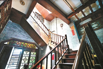 木质楼梯通向办公场所、演唱录音室和天台小花园
