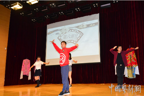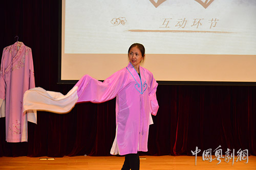 互动环节掀起了讲座的一个小高潮,学生们争相举手,踊跃参与,上台学习把子功、水袖功、虚拟表演和基本表演身段。