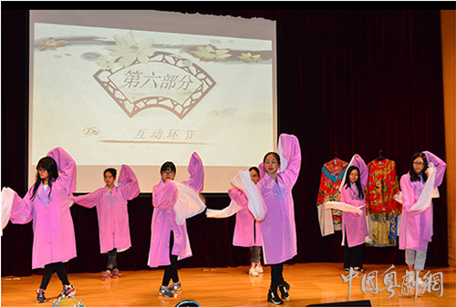 活动结束时,被粤剧艺术感染的同学们纷纷走近舞台欣赏粤剧的服装、头饰,并上台要求与邱小娜老师和演员们合影留念。