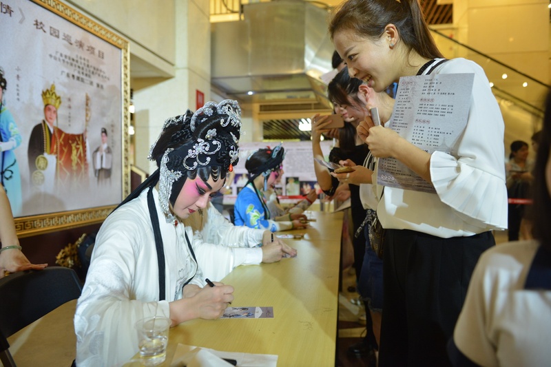 一连两晚的演出,广东粤剧艺术中心剧场座无虚席,学子们从走进入剧场已经对剧场大堂的“白素贞、许仙、小青的人形版造型”倍感兴趣,纷纷上前摆起pose合照。全剧140分钟的演出中,演员们精彩动情的演出,现场掌声接着掌声。谢幕的时候,师生们用整齐的掌声跟随着音乐节奏回馈演员,久久不愿离座。在演出结束后的主演见面会上,广东粤剧艺术中心大堂更掀起另一个高潮,大小戏迷纷纷排队签名合照。