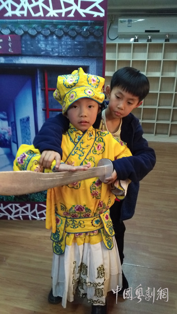 当天有些到场家长和嘉宾看见漂亮的戏服忍不住也童心大发,跟着孩子一起排队,穿戏服,穿上后还非常虚心地跟“小师傅”学动作、摆造型、拍美照。