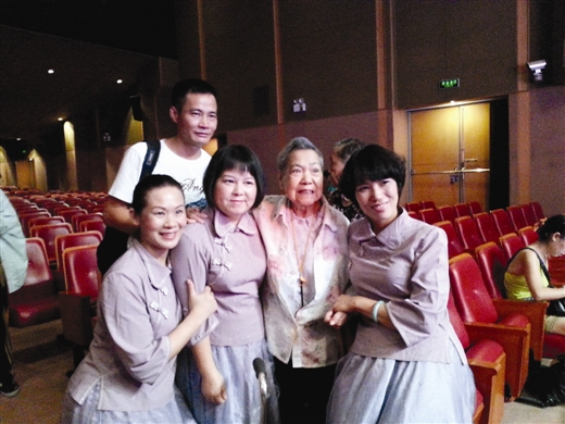被家人搀扶着的杨丽珠老人很激动,“他们演得太好了!”杨丽珠多年前移居澳门,是原南宁戏剧院的前身南宁粤剧界的著名表演艺术家,她在上个世纪50年代,曾与粤剧大师红线女一起合作粤剧影片《搜书院》,一个演小姐,一个演丫鬟。如今,红线女去逝已经有一年,杨丽珠看到来自家乡的演出,高兴地与演员们和乐手们合影留念。