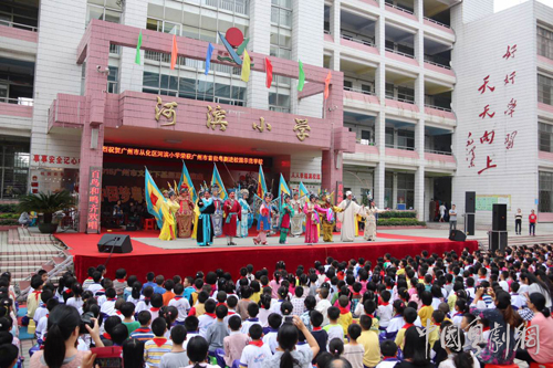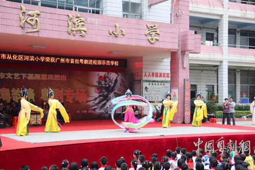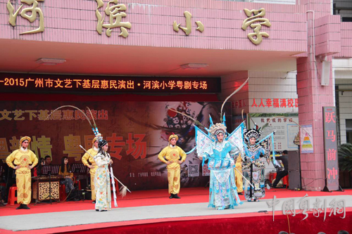 为丰富小学生课余生活,传承弘扬岭南传统文化,由广州市委宣传部,广州市文化广电新闻出版局,广州市振兴粤剧基金会共同主办的2015广州市文艺下基层惠民演出——“中国梦·粤韵情”粤剧专场于11月16-17日在从化举行,广州粤剧院·红豆粤剧团走进河滨小学和从化小学,奉送《风雪山神庙》、《七姑姐开店》、《猴王借扇》、《抢笛》等多个精彩折子戏表演,青年演员们与在校师生齐聚一堂,共享这场艺术盛宴。