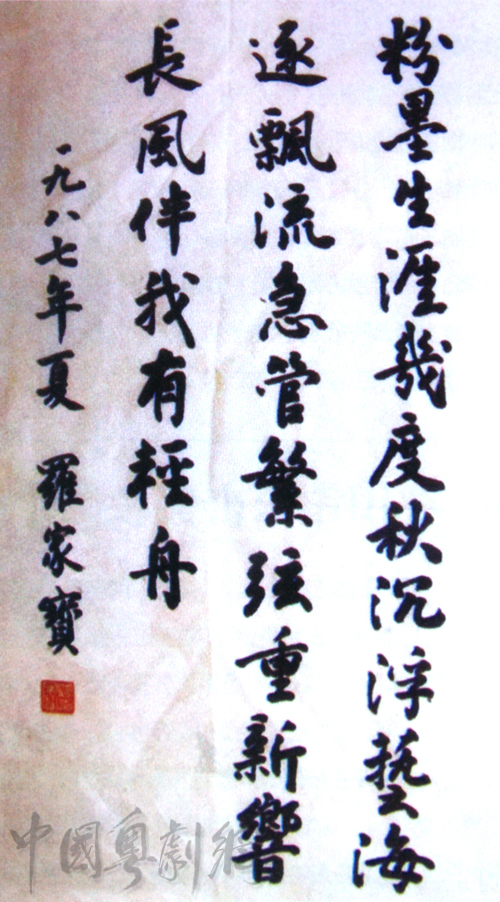“他叫罗家宝,会讲广州话的人大多知道他,尤其是喜欢看戏听歌的女士。一辈子为爱好而演出,而尽精力。可以说,他是用了一辈子的美好来换取艺术的成就!”——这是中国美术家协会副主席、酷爱粤剧的著名画家林墉2002年为罗家宝的自传《艺海沉浮六十年》(由笔者主编)所写的“序”中开头的几句话。
