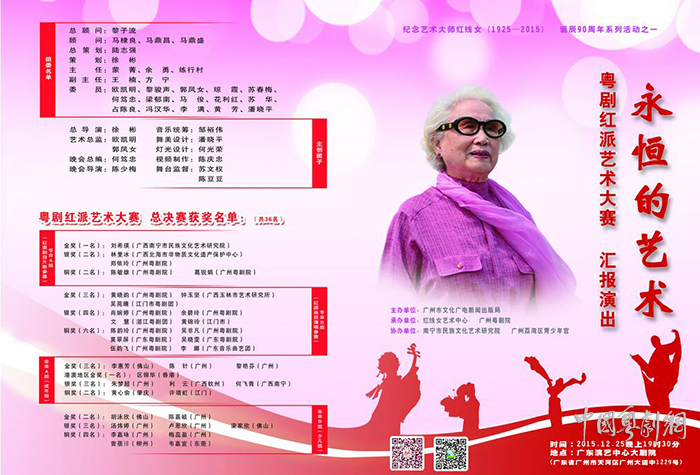 今年是粤剧大师红线女诞辰90周年,为缅怀一代宗师红线女、宣扬红派艺术、促进粤剧事业的发展,红线女艺术中心联合广州粤剧院等单位举办纪念艺术大师红线女(1925-2015)诞辰90周年系列活动。