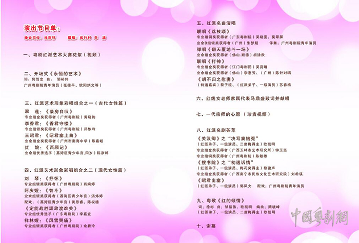 粤剧红派艺术大赛的成功举办,为红派艺术的传承发展,为粤剧事业的继往开来,写下了亮丽的一页!在纪念红线女大师诞辰90周年之际,红派弟子代表与大赛获奖代表,联手倾情演绎红派名曲名剧,向一代宗师、粤剧同行和广大观众作个汇报。