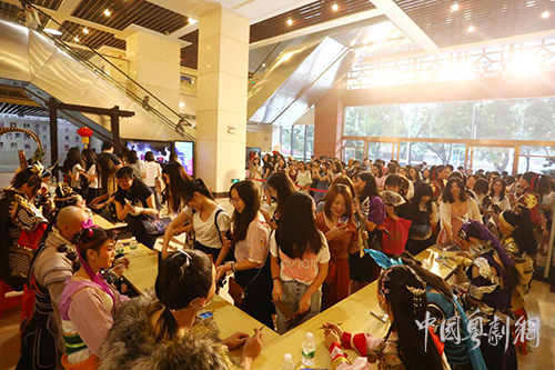 演出剧场大厅内,《决战天策府》的演员们与观众亲密互动(本站资料图片)