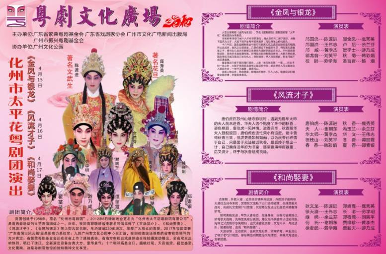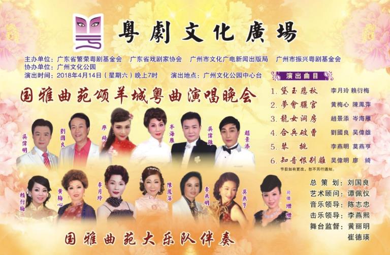 2018年的4月粤剧文化广场于4月10日晚开场,于4月10-17日晚在文化公园中心台隆重上演!本次演出邀请到国雅曲苑、深圳市粤剧团、化州市太平花粤剧团等一众专业团队倾情演出,精彩不容错过!
