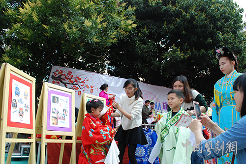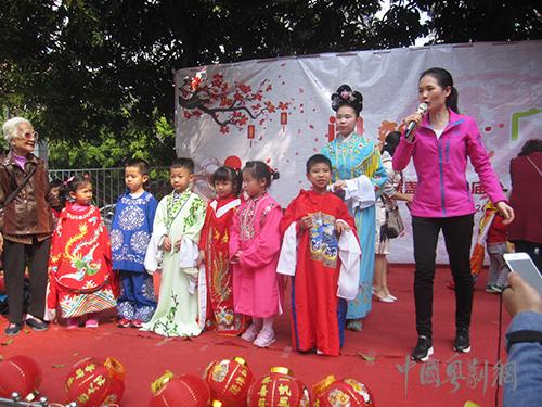 “粤演粤架势演艺街”里,全体师生、家长和嘉宾欢聚一堂,观赏欢贺新春特色文艺表演,有古筝、手鼓合奏,鳌鱼舞等。其中来自街口的街其小红豆艺术团带来了经典粤剧节目《荔枝颂》和《游园惊梦》。舞台旁边还设有戏服展示、粤剧常识图文展板。演出之后的互动环节中,粤协志愿者姚冠冰婆婆、邝玉莲、黄捷芬、邝心怡,为有兴趣的小同学穿上戏服,讲解每种戏服所扮演角色的特点,教他们粤剧“兰花指”、“剑指”、“云掌”、“指掌”基本手型以及“撇步”、“丁字步”等台步。志愿者和小同学的互动,获得小朋友和家长们的热烈掌声。