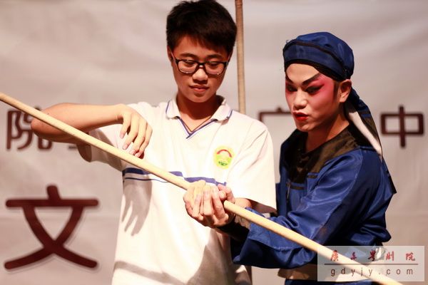 此次“文化沙龙”的主旨是让学生通过切实的亲身经历和探索,接受历史文化教育和艺术熏陶,培养他们对本土文化与粤剧传统的认识和热情。因此,司仪特意在每个折子戏之间穿插讲解粤剧的基本知识,并在折子戏展演结束后,我院安排演员与学生互动的环节,让意犹未尽的同学们随同演员学习耍水袖、把子功等戏曲表演动作。