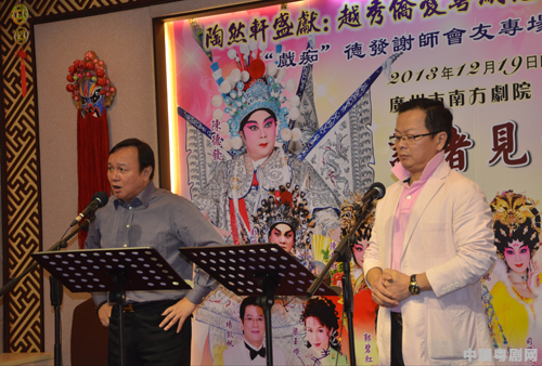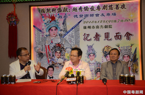“越秀侨爱慈善夜——‘戏痴’德发谢师会友专场”,将于12月19日晚在广州南方剧院举行。这个专场演出,由陈德发越秀区侨商会、越秀区侨联青年委员会主办,在广州粤剧团、南方卫视粤唱粤好戏栏目、广东电台南方生活广播承办。11月25日下午,陈德发在黄振龙粤艺沙龙举行的记者见面会中,发布了这一消息。