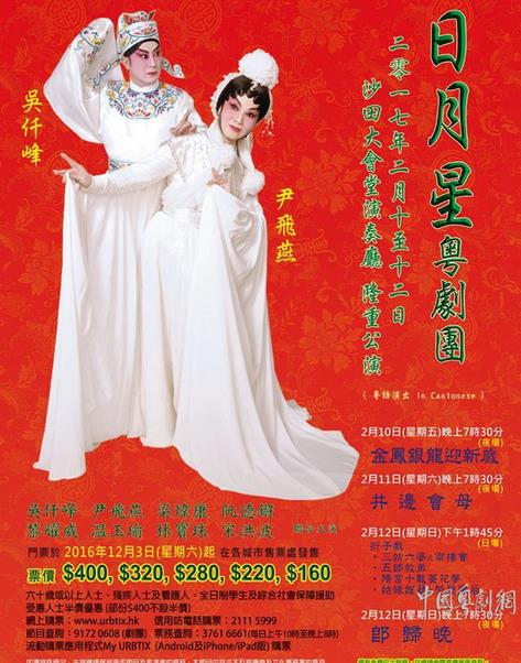 由香港日月星粤剧团主演的粤剧《金凤银龙迎新岁》、《井边会母》、折子戏专场、《郎归晚》等将于2月10日-12日分日夜场在香港沙田大会堂演奏厅隆重公演,届时吴仟峰、尹飞燕、梁炜康、阮德锵、黎耀威等多位粤剧红伶倾力献演,新春佳节,好戏连连,万勿错过啦!