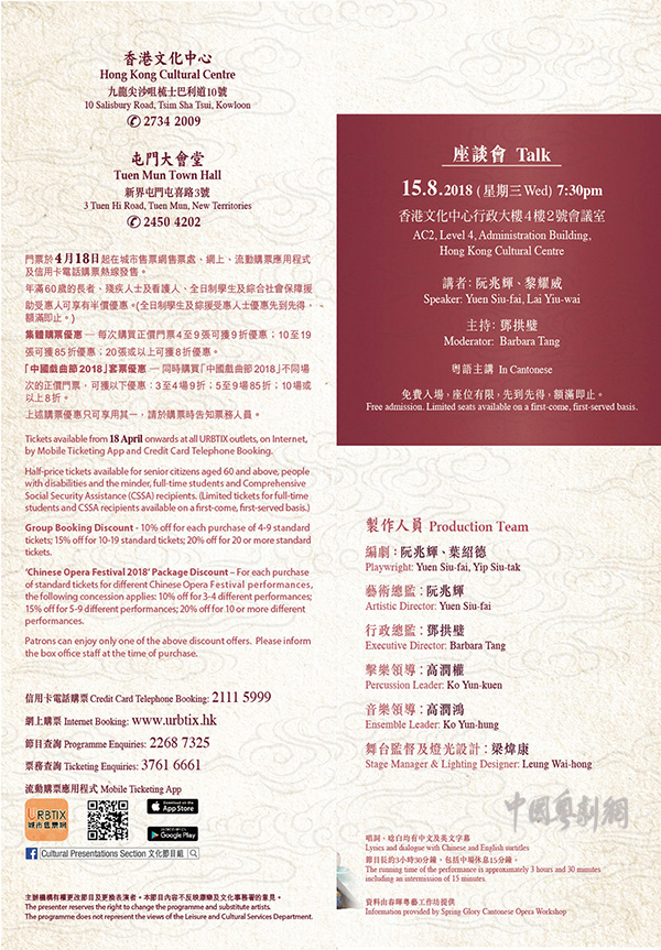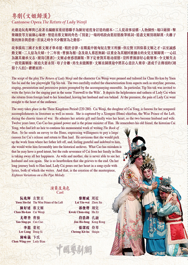 粤剧《文姬归汉》将于8月7-8日在香港文化中心大剧院隆重上演。本剧为2018中国戏剧节的参演剧目之一,由粤剧名伶阮兆辉、陈好逑、李龙、尤声普、陈咏仪、黎耀威等人领衔主演,为阮兆辉与已故著名编剧叶邵德联手为陈好逑度身打造的剧本,塑造了蔡文姬这一经典角色。该剧还将于8月12日在屯门大会堂演奏厅加演一场,并在8月15日于香港文化中心行政大楼举行座谈会。请感兴趣的戏迷朋友们千万不要错过!