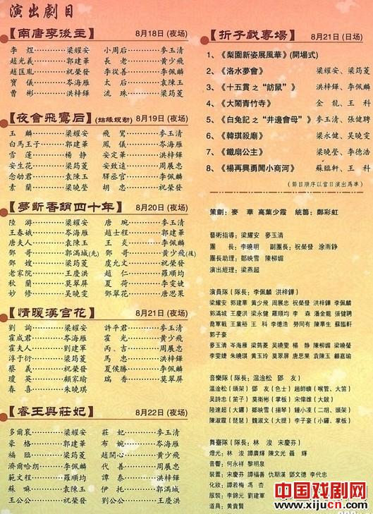 她特别提出八月二十日的折子戏的专场︰「那一天的折子戏专场和平时有些不同,因為平时我会和梁耀安合演一个折子戏,其他才交由新秀演员去演,但今次我和他分别与两位新人张健聘,梁筠菱演《白兔会之井边会母》及《洛水梦会》,两位新人和我们台上合作,希望有实质的体验。其他还有新人演出的《十五贯之访鼠》、《大闹青竹寺》、《韩琪杀庙》、《铁扇公主》及《杨再兴勇闯小商河》。」