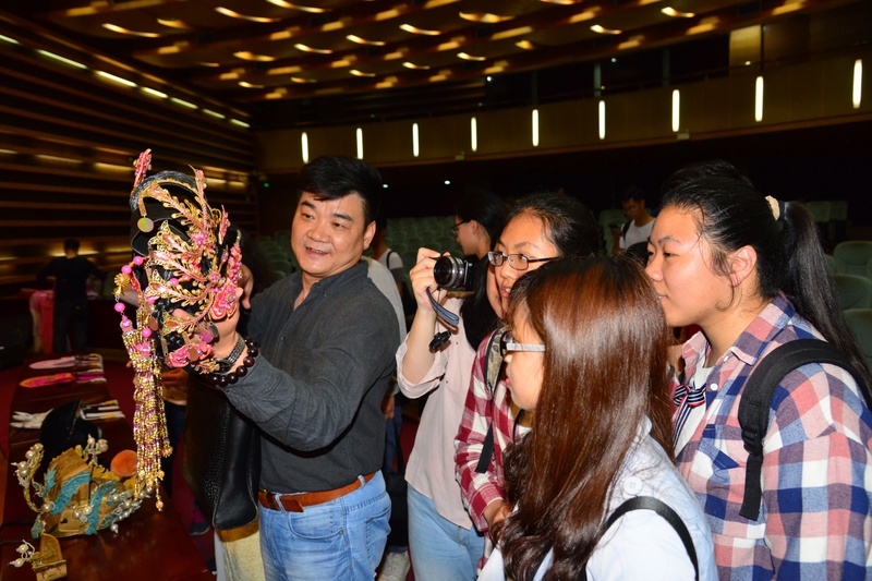 活动压轴节目,由我院国家一级演员刘建科、国家二级演员岑海雁为师生们带来经典粤剧折子戏《柳毅传书之“花好月圆”》,精彩的演出赢得阵阵掌声。活动结束时,被粤剧艺术感染的同学们纷纷走近舞台欣赏粤剧的服装、头饰,并上台要求与邱小娜老师和演员们合影留念。