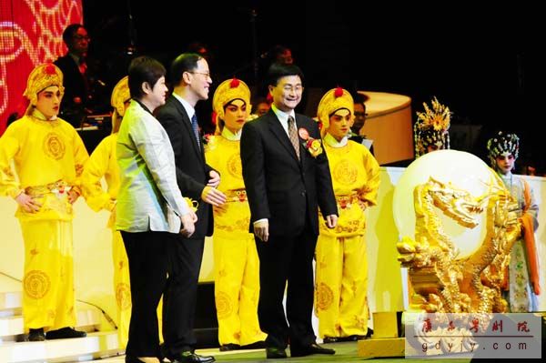 广东省文化厅厅长方健宏(右四),香港特别行政区民政事务局局长曾德成(右三),澳门特别行政区文化局局长何丽钻(右二)等出席观看。