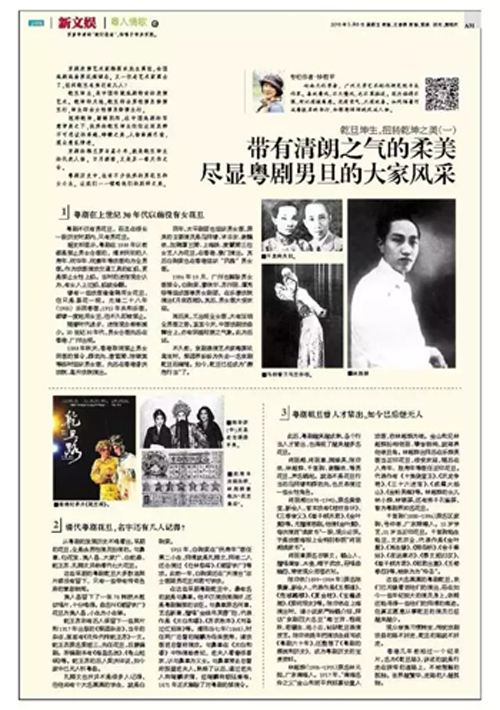 粤剧历史中,也有不少优秀的男花旦和女小生。让我们一一领略他们的别样之美。那种略带“硬朗”的收敛,反而提升出大家风范的娇媚。 在上世纪30年代之前,粤剧禁止男女合班 粤剧不仅有男花旦,而且在很长一段历史时期内,只有男花旦。据《粤剧大辞典》介绍,粤剧在1933年以前都是禁止男女合班的,清末民初的人寿年、祝华年、祝康年等戏班均为全男班。作为戏班演戏交通工具的红船,更是禁止女性上船。当时的迷信观念认为,有女人上过船,船就会翻。曾有一些戏班偷偷聘用女花旦,但只是昙花一现。光绪二十八年(1902)乐同春班,1912年共和乐班,都曾一度起用女旦,但不久即被禁止。 随着时代进步,迷信观念渐渐减少。20世纪30年代,男女合班先后在香港、广州出现。 1933年秋天,香港取消禁止男女同班的禁令,薛觉先、唐雪卿、陈锦棠等临时组织男女班,先后在香港普庆戏院、高升戏院演出。同年,太平剧团也组织男女班,原来的主要演员是马师曾、半日安、谢醒侬,加聘谭兰卿、上海妹、麦颦卿三位女艺人为花旦,在香港、澳门演出。其后白驹荣也在香港组织“风雅”男女班。 直至今天,中国戏剧戏曲舞台上,亦有阴盛阳衰之气象。此为后话。 不久前,京剧表演艺术家梅葆玖离世时,梨园纷纷为失去一名京剧乾旦而痛惜。如今,乾旦已经成为“濒危行当”了。 清代粤剧花旦,名字还有几人记得? 从粤剧的发展历史不难看出,早期的花旦,全是由男性演员扮演的。勾鼻章、仙花发、美人昌、大家广、白蛇森、蛇王苏、扎脚文并称清代七大花旦。这些早期的粤剧乾旦大多连照片都没有留下,只有一些带有传奇色彩的掌故轶闻。美人昌留下了一张78转胶木粗纹唱片,十分难得。曲名《闺留学广》,花旦为美人昌,小生为小生铎。蛇王苏则有后人保留下一些照片和1917年出版的《梨园杂志》,里面有《优伶列传蛇王苏》一文。蛇王苏原名梁垣三,先任花旦,后兼编剧。所编剧本有《海盗名流》、《龟山起祸》等。蛇王苏的后人梁庆祥说,如今家中已无人听粤曲。扎脚文也许并不是很多人记得,但他却有个大名鼎鼎的学生,就是白驹荣。1912年,白驹荣在“民寿年”班任第二小生,师傅就是扎脚文,师徒二人还合演过《仕林祭塔》、《闺留学广》等戏。此前一年,白驹荣还在“天演台”志士班跟男花旦郑君可学戏。 在这些早期粤剧乾旦中,最有名的就是勾鼻章。他不仅演戏演得好,还是粤剧解禁的功臣。勾鼻章原名何章,艺名新章,擅唱“金线吊芙蓉”腔,代表作是《太白和番》、《苏武牧羊》、《刘备过江招亲》等。清同治七年(1868),时任两广总督的瑞麟为母亲贺寿,请戏班到总督府演戏。勾鼻章在《太白和番》中饰演杨贵妃,老夫人看着很喜欢,认勾鼻章为义女。勾鼻章常去总督府探望老夫人,熟络了以后,通过老夫人向瑞麟求情,经瑞麟向朝廷奏准,1871年正式解除了对粤剧的禁演令。 粤剧乾旦曾经人才辈出,如今后继乏人 此后,粤剧越来越成熟,各个行当人才辈出,也涌现了很多名花旦。肖丽湘、肖丽章、千里驹、嫦娥英、陈非侬、林超群、谢醒侬等男花旦,声名鹊起。就连不是花旦行当的马师曾和薛觉先,也反串饰演过一些女性角色。 肖丽湘(1878-1941),原名黄焕堂,新会人,首本戏有《桂枝告状》、《三春审父》、《崔子弑齐君》、《金叶菊》等。尤擅演悲剧。他演《金叶菊》,每次演到“读家书”一段,观众必哭。于是戏班海报上会特别标明“肖丽湘读家书”。 肖丽章原名古锦文,鹤山人,擅唱南音、木鱼,精于武戏,而唱曲幽怨,常使观众泪湿衣衫。 千里驹(1888-1936)原名区家驹,号仲吾,广东顺德人。12岁学艺,21岁当正印花旦。千里驹能生能旦,文武双全,代表作是《金叶菊》、《再生缘》、《顺母桥》、《舍子奉姑》、《夜送寒衣》、《蔡文姬归汉》,《崔子弑齐君》、《昭君出塞》、《玉楼春怨》等,被称为“伶圣”。 陈非侬(1899-1984)原名陈景廉,新会人,代表作是《玉梨魂》、《危城鹣鲽》、《夏金桂》、《宝蟾进酒》、《梁祝恨史》等。陈非侬在上海演出时,请小说家严独鹤介绍,拜访京剧“四大名旦”梅兰芳、程砚秋、荀慧生、尚小云,钻研乾旦表演技艺。陈非侬晚年把演戏生涯写成《粤剧六十年》,还整理了《粤剧的源流和历史》,成为粤剧历史的宝贵资料。 林超群(1906-1955)原名林元挺,广东南海人。1917年,“南海名伶之父”金山和到平洲招募幼童入戏班,收林超群为徒。金山和见林超群扮相俏丽、嗓音甜润,就培养他做旦角。林超群出师后在乐群英班当正印花旦,很受欢迎,随后在人寿年、胜寿年等班任正印花旦。代表作有《十美绕宣王》、《双龙争艳》、《三十六迷宫》、《威震火焰山》、《金粉英雄》等。林超群的女儿林小群、林锦屏,还有弟子孔雀屏,都是著名粤剧花旦。林超群有几首录音留存,初听宛如娇美女声,细听之下,感受到一种相当有分寸的力量拉住声音与情绪,反添跌宕。这是乾旦歌声的含蓄之美,十分耐听。 这些大名鼎鼎的粤剧乾旦,我们已无缘看到他们的演出,而在如今一些年纪较大的演员身上,依稀还能寻得一些他们的乾旦师傅的痕迹。但真正愿意从事乾旦的演员已经越来越少。观众审美习惯转变,传统戏剧戏曲的路不好走,乾旦的路就更不好走。香港几年前拍过一个纪录片,名为《乾旦路》,讲述的,就是行走在狭窄道路上不被理解的孤独。世界