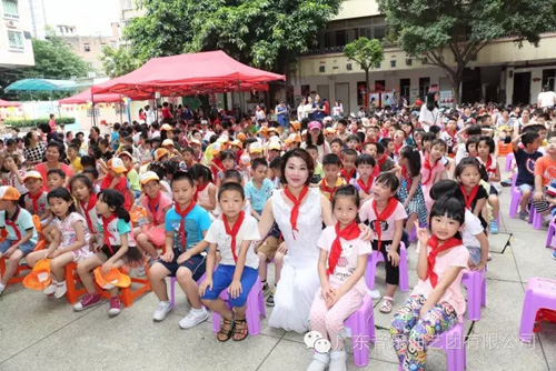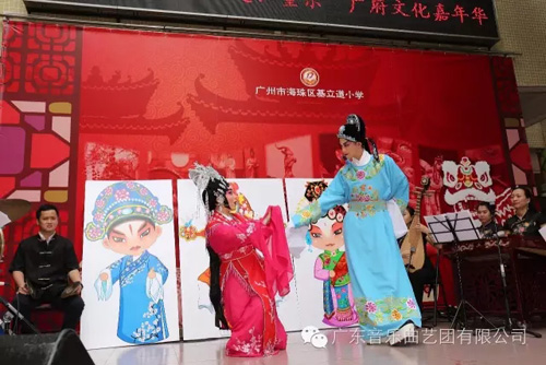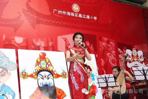 5月31日,我团来到了海珠区基立道小学,为现场师生带来了一场生动有趣、精彩不断的广东音乐曲艺视听盛宴。现场气氛热烈,台上台下互动不断,就粤曲中的角色行当及广东音乐特色乐器等基本知识进行了生动说明和简要介绍,以帮助在座师生更好欣赏演出节目。当一幅幅颜色艳丽、活泼可爱的粤曲人物卡通形象展示在舞台上时,立即吸引了全场师生的目光,再结合形象生动、通俗易懂的讲解,让现场小听众们听得格外认真,一个个皆是聚精会神、目不转睛。