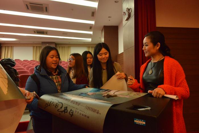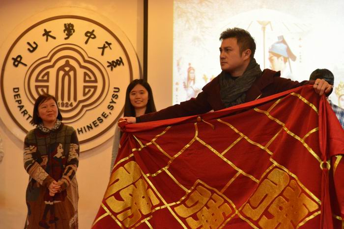 当晚中山大学刮起了一阵“粤剧风”——等比的主演模型,戏服,道具等元素的展示,艺术沙龙会场俨然成了一个小型的“粤剧展览馆”。剧组主演、主创以访谈形式,以“相遇”及“情”为主线,透过视频、音乐、图片,全方位为听众解密《白蛇传·情》的创作历程,与青春学子一起分享其中心得。艺术沙龙中,曾小敏、文汝清、朱红星、王燕飞等主演与学子零距离互动。学生兴致勃勃地跟着主演“摆造型”,学习剧中的表演动作。