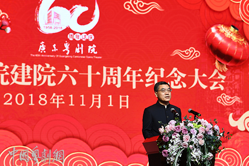汪一洋厅长在纪念大会上致辞。他指出,广东粤剧院取得的成就,离不开一代又一代“粤剧院人”的拼搏奋进和薪火相传。回望过去的60年,广东粤剧院始终坚持“出人出戏出效益”的宗旨,坚持实干苦干、改革创新,用艰辛的汗水换来辉煌的收获,造就了马师曾、红线女、罗品超、罗家宝等几代粤剧名家及一大批优秀艺术人才,创作演出了包括《搜书院》《关汉卿》《山乡风云》《柳毅传书》《荆轲》《花蕊夫人》《伦文叙传奇》等粤剧经典名剧在内的600多个观众喜闻乐见的精品佳作,在广东粤剧艺术发展史上谱写了绚丽的篇章,成为名扬海内外的示范性、标志性地方戏曲艺术院团。希望广东粤剧院全体演职员工为建设文化强省、推动我省文化艺术走在全国前列作出新的更大贡献!