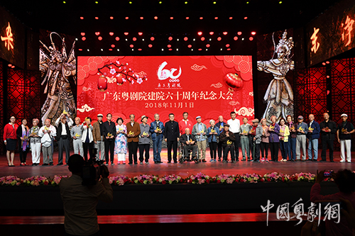 六十华诞,广东粤剧艺术中心洋溢着喜气洋洋的气氛,广东粤剧院人五代同堂。广东粤剧院还为36位“从建院起在该院工作到离退休”的老前辈颁发了纪念品。86岁的著名粤剧表演艺术家林小群专程从海外赶来,并代表离退休老员工发言。她深情回忆了在粤剧院的往昔峥嵘岁月。青年演员黄春强代表年轻一代也表达了薪火不息、代代相传,努力推动粤剧发扬光大的决心。