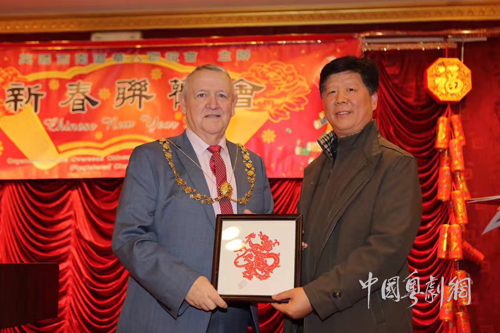 晚会上,余勇董事长代表艺术团做了深情发言,他表示很感谢省委宣传部、省文联及省民间文艺家协会组织本次交流活动,为岭南艺术的海外传播、推广及交流提供了良好机会和平台,希望借此机会能让更多的华人华侨和国际友人领略到传统岭南文化艺术魅力。余勇董事长还向布里斯托市长赠送了剪纸工艺品。
