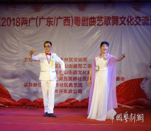 本次汇演执导、广西粤剧名家张定湘(左),郭翠英(右)激情献演粤曲原创表演唱《歌颂十九大》