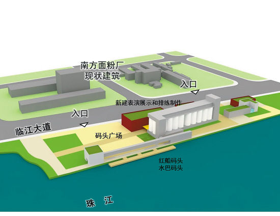 由于南方面粉厂是工业文化遗产,红船码头的建设不会拆除用地范围内的遗产建筑,而是进行改造和活化利用。未来,粤剧红船码头和配套设施的功能主要包括表演展示、排练制作、游客服务、办公生活等4大类,利用现状南方面粉厂南筒库(约4000平方米)及幼儿园(约1500平方米)共约5500平方米进行内部空间改造,另新建7300平方米作为表演区及大厅(新建表演展示场所4800平方米,新建排练制作场所2500平方米),合计建筑面积12800平方米,容积率0.54。新建建筑高度9-15米,建筑密度30%,码头广场6000平方米,约可容纳2000人参观。