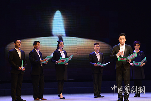 黎子流老市长、众艺术家和台下观众齐声颂唱《无疆大爱暖梨园》