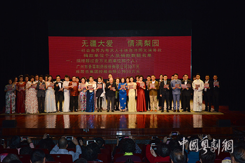 3月11日下午,由广州市振兴粤剧基金会倡议并牵头主办,广东省繁荣粤剧基金会、省戏剧家协会、广东粤剧促进会、广州粤剧院、广东粤剧院、红线女艺术中心主办,中国粤剧网、广东广播电视台岭南戏曲频道、珠江经济台、广东广播电视台南方生活广播、南方卫视粤唱粤好戏栏目、吴川市文化广电新闻出版局、吴川市粤剧演出行业协会、红船粤剧网、广东省丹姿慈善基金会协办的“无疆大爱·情满梨园----社会各界为粤艺人士扶危济困义演筹款”活动在广州市南方剧院举办,来自广州、深圳、佛山、吴川、香港等地的40多名著名粤剧曲艺艺术家、一线演员和150多名粤剧艺术工作者和志愿者参演,演出门票在售票开始的两天内售馨,活动筹得善款222.58万元。