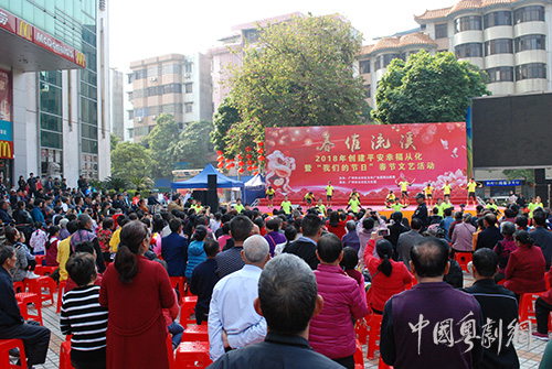 演出当天,从化街口新世纪广场人潮攒动,贺岁舞台地板红毯铺设,叠幅黄绸布围边,舞台巨幅画板幕景引人注目。从化小红豆艺术团孩子们盛装上演了《荔枝颂》、《游园惊梦》等粤剧节目。此外,还有其他剧组上演童声独唱、舞蹈、集体跳绳操等,叠彩纷呈,引发观众们的热烈掌声。正可谓是: