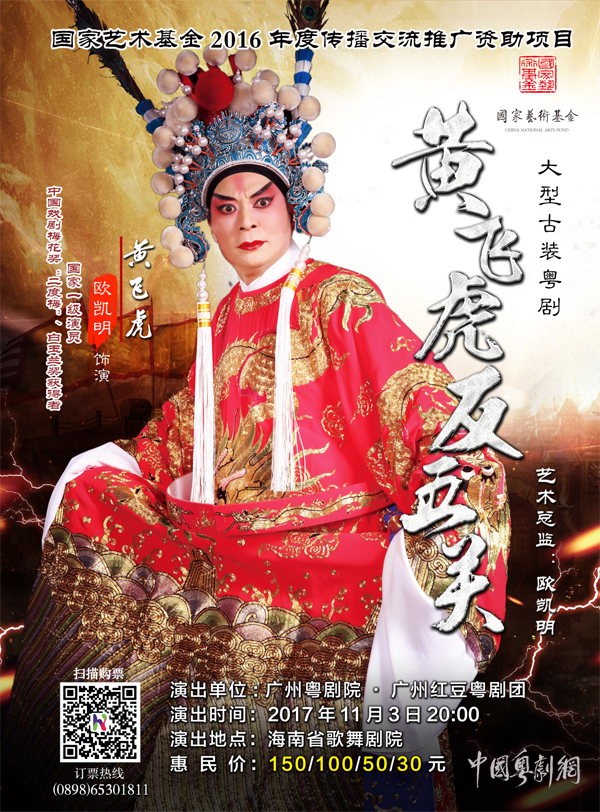 广州粤剧院承担实施的国家艺术基金2016年度传播交流推广资助项目粤剧艺术中国行将于2017年11月2日、3日在海南省歌舞剧院分别演出同名琼剧改编的粤剧《搜书院》和传统粤剧《黄飞虎反五关》。剧目将由粤剧艺术名家欧凯明(梅花奖二度梅得主)、黎骏声、崔玉梅、苏春梅等四位梅花奖演员分别主演。