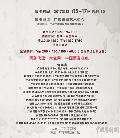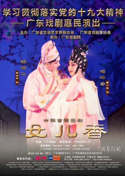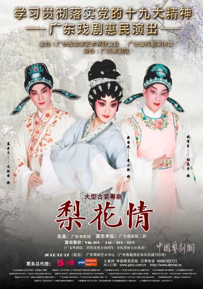 2017年12月15-17日晚,由广东省文学艺术界联合会、广东省戏剧家协会联合主办,广东粤剧院承办的“学习贯彻落实党的十九大精神——广东戏剧惠民演出”系列活动将在广东粤剧艺术中心举行。届时,广东粤剧院二团将为广大观众戏迷上演大型古装粤剧《兰陵王》、《梨花情》、《女儿香》,三台大戏均由我院中国戏剧梅花奖获得者、国家一级演员曾小敏,国家一级演员彭庆华、文汝清、李虹陶,国家二级演员王燕飞、冼鉴棠、刘建科、严金凤,翟春燕、朱红星以及优秀青年演员程君捷、杨静、潘健等主演。