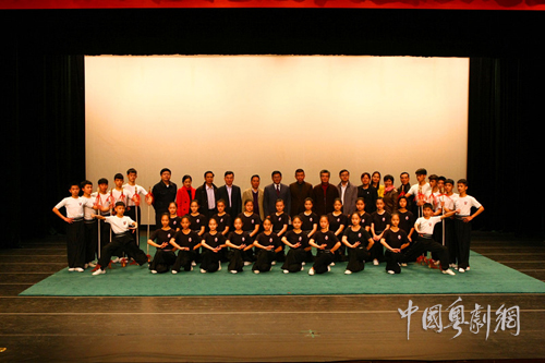 出席签约与揭牌仪式的领导、嘉宾和粤剧表演班学生合影