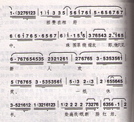 第二句“招赘在相府中”,“招赘在”是衬字,“相府中”三个字与第一句又有不同的处理。红线女把“相”字的拖腔延伸到底板的前1/4拍,马上在底板的后3/4拍起唱“府”字,把原板式应唱的“府”字的那个叮,用作“府”字的拖腔。这样,第一个字的时值,由原来的一拍,扩展为1又1/4拍,第二个字的时值,由原来的一拍扩展为1又3/4拍。在板式中①②③三个字的位置就变化成了这样: