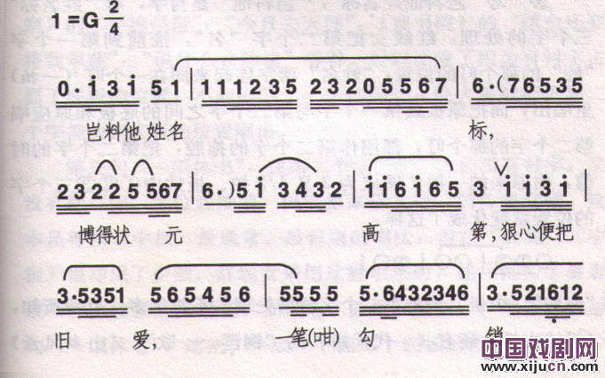 前面那个曲谱,由于〔反线中板〕第三句的⑦⑧⑨⑩四个字转唱了〔乙反二簧慢板〕,所以有第九个字的只有两句。第一句“狠心便把旧爱一笔(咁)勾销”,“狠心便把”和“一笔(咁)”都是衬字。因为“勾”字前有三个衬字已占去了底板的位置,“勾”字就不能推前,只能按照原来板式落在那个叮的位置。第二句“他只见新人欢笑”,红线女就把第八个字“人”字的拖腔延伸到底板的前1/4拍,把第九个字的“欢”推前到底板的后3/4拍唱出。这样,第八个字的时值就从原来的一拍扩展为1又1/4拍,第九个字由原来的一拍扩展为1又3/4拍。⑦⑧⑨⑩四个字在板式中的位置就变化成了这样: