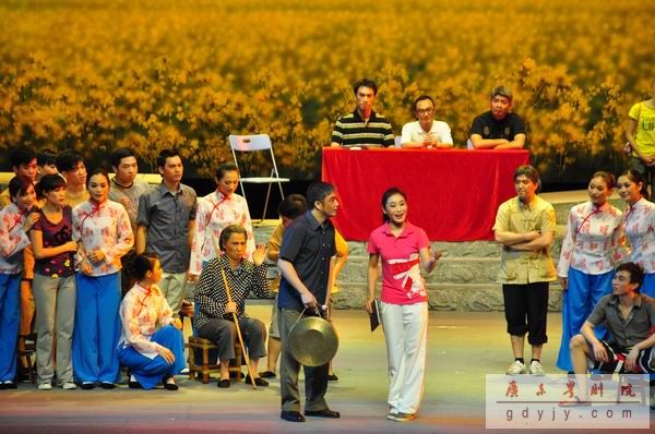 同时,主创人员在展现粤剧魅力的方面也不遗余力。如第六场“抗洪救灾”一幕,“文青”和“阿娣”以缆绳代替水袖,白色薄纱代替雨衣,在雨风飘摇之中大耍“串反身”; 如回城借钱一幕中,“林春华”为逗“文青”展现的一段连环甩包,动作紧凑,干净利落。此外,村委会选举时的两场群体板凳舞,活泼逗趣,“鬼马”新奇;抗洪一场的群体表演中,男女演员们巧妙融合“前桥”、“探海”等身段,营造出紧张壮阔的群体抗洪场面,尽展粤剧武戏之美。