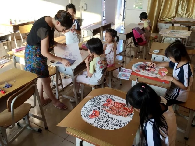 何老师老师指导学生进行粤剧绘画