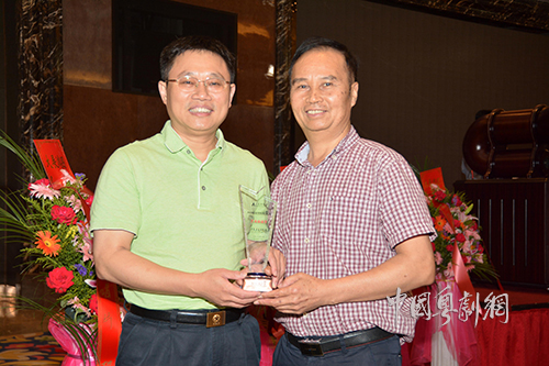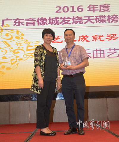 广州市文广新局调研员徐淑仪(左)为广东音乐曲艺团董事长黄润根(右)颁发”广东音乐曲艺团艺术成就奖“