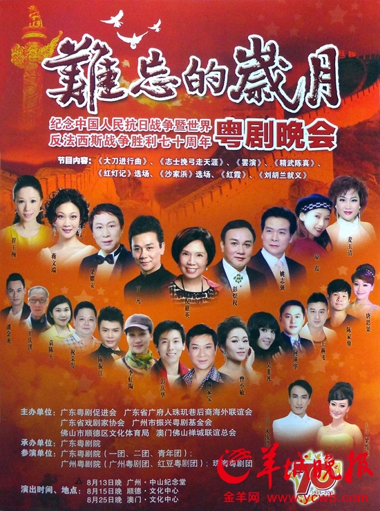 8月13日-25日,“难忘的岁月——纪念中国人民抗日战争暨世界反法西斯战争胜利70周年”粤剧晚会将演出三场,广东粤剧界的9位“梅花奖”得主将登台献艺。其中,8月13日晚上7:30分,在广州中山纪念堂举行首场演出;8月15日晚在顺德文化中心上演第二场;8月25日晚在澳门文化中心献演第三场。