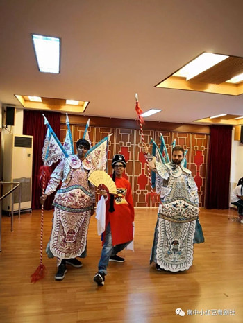 外国朋友们在南海中学同学们的帮助下学习粤剧身段
