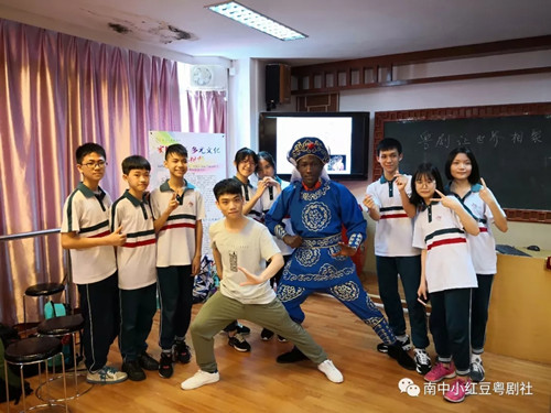 5月19日下午,广东外语外贸大学的外国志愿者来到南海中学,与南中粤剧社的小红豆们开展了一次别开生面的粤剧文化中外交流活动。这是由AIESEC广外国际青年公益项目部举办的跨文化教育类公益项目,目的在于拓宽中外青少年的眼界,充分感受世界文化的多元,培养全球化视野。南中粤剧社的同学们和初二1班、4班的部分同学,热情的接待了这些可爱的外国朋友。在粤剧老师的带领下,外国朋友了解了粤剧的悠久历史和文化特色,并在同学们的帮助下穿上了戏服,学做了粤剧身段,亲身感受了粤剧的无穷魅力。
