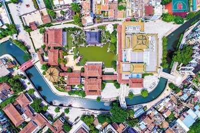鸟瞰粤剧艺术博物馆,是中心大水庭配合六组别院的院落格局