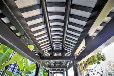 当代建筑工程技术能否充分支持与发扬传统建筑工艺之美,解决传统表现与现代技术之间的关系,是这次粤剧艺术博物馆建筑工程设计过程中遇到的最大难难题。古典园林的形态依然要满足现代建筑在技术和消防上的标准要求,为了应对抗震、消防等现代建筑工程的要求,在粤博物馆的建筑群中,设计团队采用了一种“木包钢”的结构形式一一在钢结构外面用传统木材拼合包裹组成梁柱,辅以传统建筑装饰,既能够再现岭南建筑的木构风格,又能满足抗震、消防等现代建筑工程的要求。外表看是经典的传统建筑,大量的木柱,连廊,但实际中间是现代的钢结构。这种木包钢的设计让施工难度大大增加,在钢上包了防火棉,再包上木,才能符合消防要求。这种施工方式也是国内率先使用的,比纯木结构的施工难度还大,开创了全国传统建筑营造之先河。