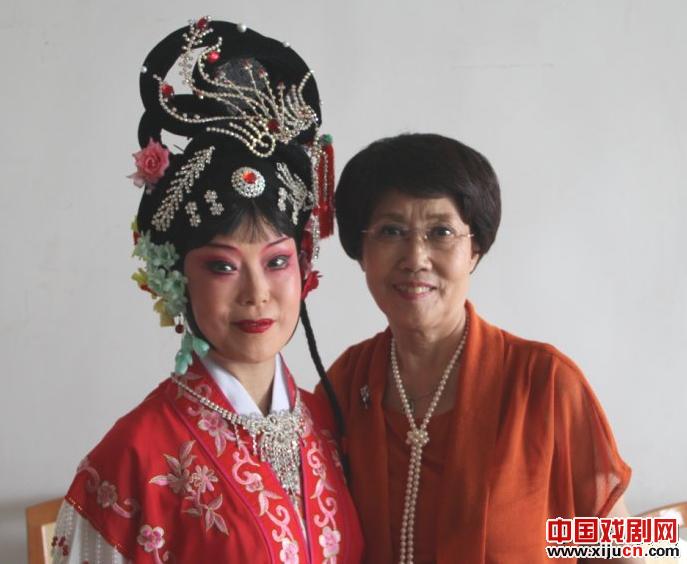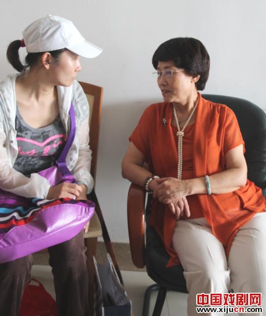 青年演员吴素真到后台看望张老师。张老师在中国戏曲学院曾为她亲授崔派名剧《卖苗郎》。