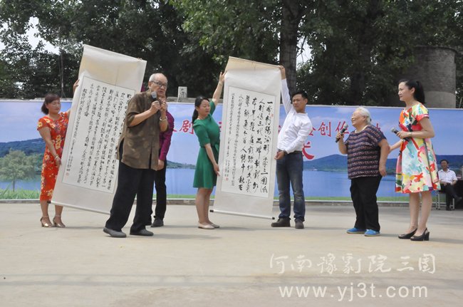 揭牌仪式结束后,我们的文艺演出在《朝阳沟》一剧银环和拴保的“双上山”中拉开了帷幕,随后我团老中青三代艺术家及青年演员为朝阳沟村的父老乡亲们奉献了清唱、小品等脍炙人口的节目,赢得了乡亲们的阵阵掌声,他们的笑容是我们节目精彩的见证。拴保娘的扮演者高洁老师的爱人尹涛先生还带来了两幅墨宝送给朝阳沟村,以表达他们对朝阳沟村的情谊。演出结束后,各位领导、各位艺术家和青年演员们集体合影留念。