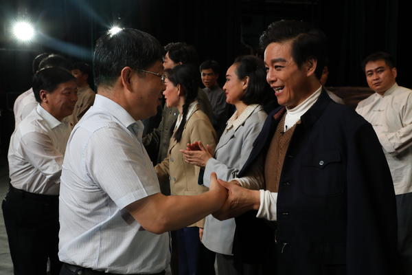 演出结束后,市委副书记、市长毛文明,市委副书记刘明胜,市人大常委会主任许国顺,市政协主席张承林上台祝贺演出成功,并与演职人员合影。(王辉 孟腾飞)